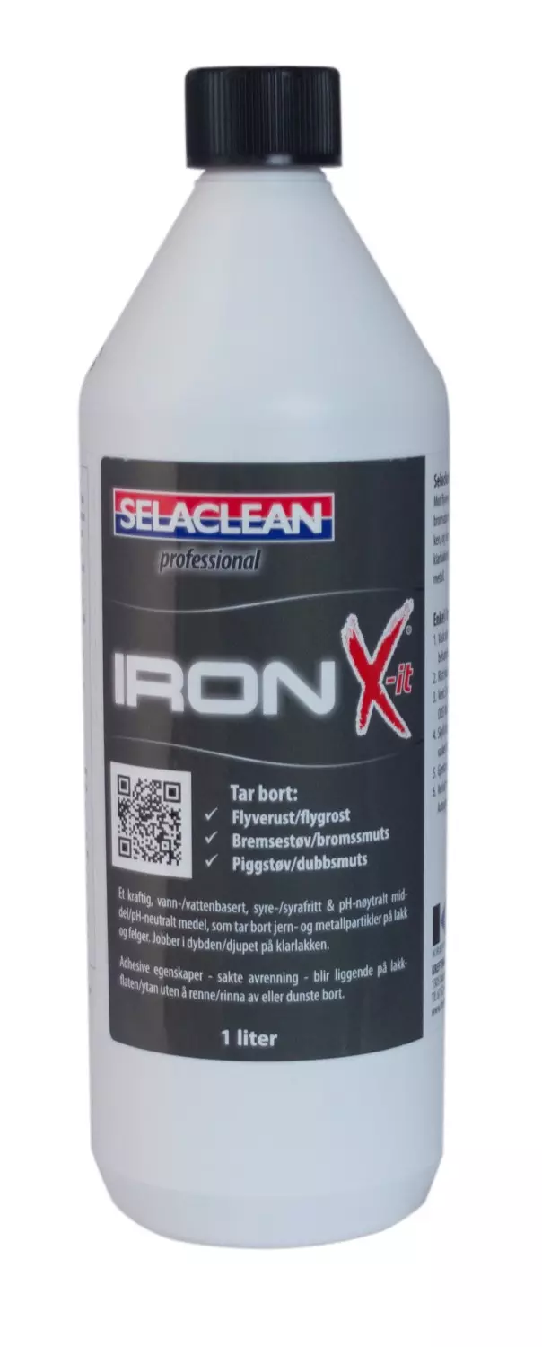 Selaclean Proff Iron X-IT 1L Refill er en effektiv metallpartikkelfjerner som er utviklet for å løse opp flyverust, bremsestøv og andre metallpartikler som setter seg fast i lakk og på felger. Slike partikler kommer ofte fra bremsesystem, veistøv og piggdekk, og kan over tid gi rustflekker og en ru overflate. Med Iron X-IT får du en grundigere rengjøring enn ved vanlig vask, og et bedre utgangspunkt før videre bilpleie.