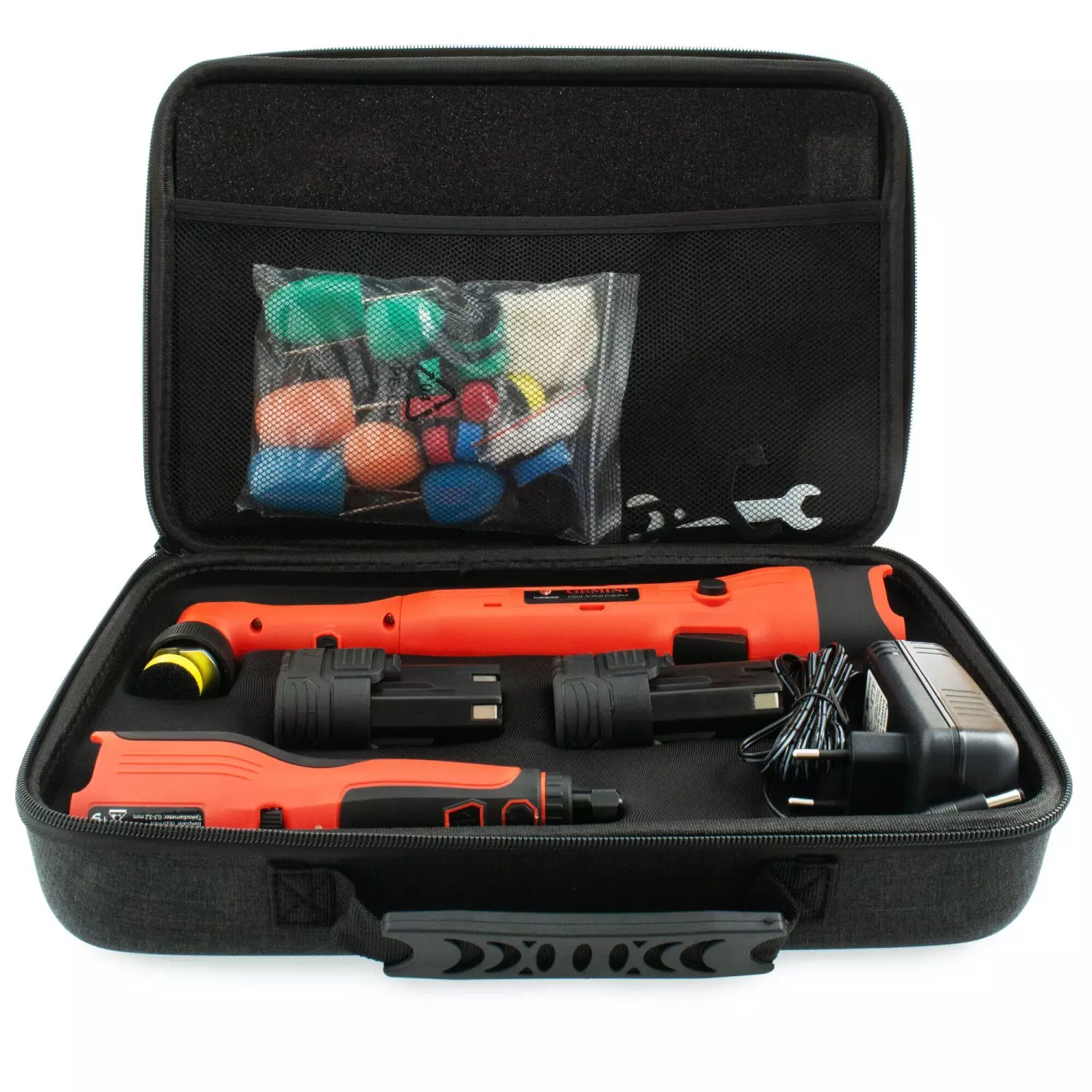 Dette poleringssettet leveres komplett med to 12V/2,0 Ah batterier og en lader som gir opptil 40–60 minutters driftstid per maskin, noe som sikrer effektiv og uavbrutt bruk. I tillegg inngår et stort utvalg poleringsputer i forskjellige størrelser og fastheter, tilpasset ulike poleringsbehov og områder. Dette gjør settet godt egnet for både grunnleggende pleie og mer detaljert korrigerende polering. :contentReference[oaicite:2]{index=2}